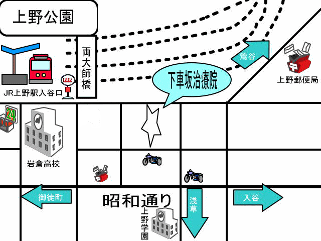 周辺地図 下車坂治療院 大きい地図を表示 〒110-0005 東京都台東区上野7-11-5-1F 03-3843-3010 アクセス JR上野駅入谷口から徒歩3分程度。 JR上野駅入谷口を背にして左に直進すると右手にあります。 青い看板が目印です。 左隣にコンビニがあります。 当院の裏に、コインパーキングが併設しています。 当院入口の右側に、LUUPのポートがあります。